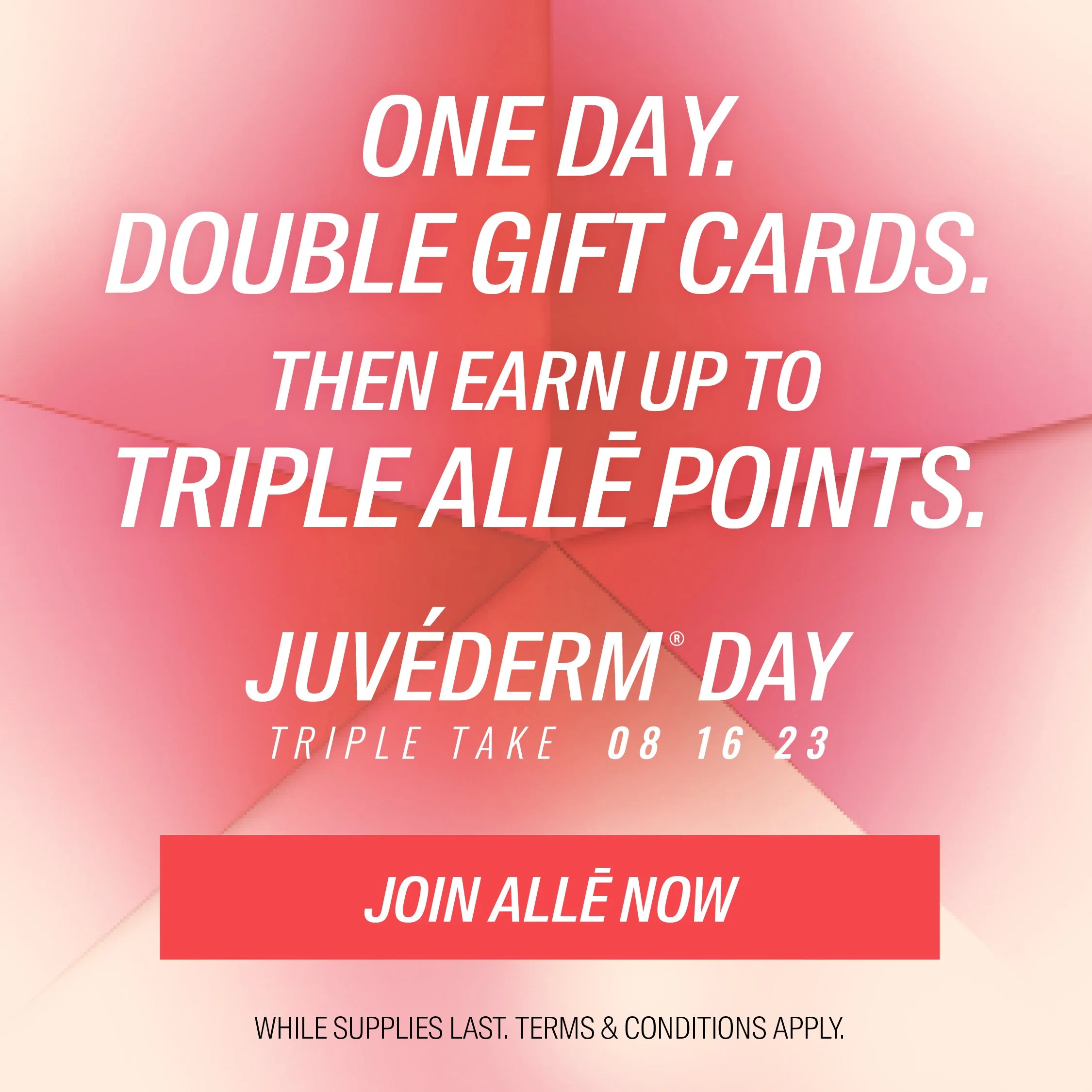 On August 16, 2023 and while supplies last, Alle Members may purchase a $75 JUVÉDERM Collection of Fillers Gift Card and get one $75 JUVÉDERM Collection of Fillers Gift Card for free.
