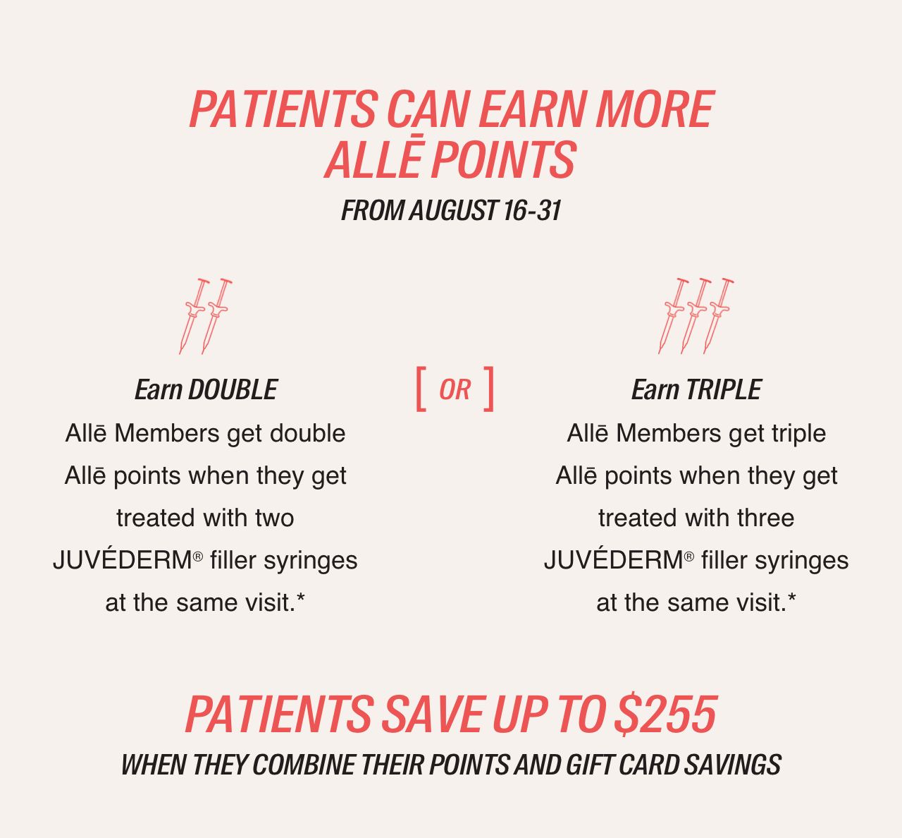 • Members who get treated with 2 JUVÉDERM Collection of Fillers syringes in the same visit will earn double Allē Loyalty Program points on those syringes and Members who get treated with 3 JUVÉDERM Collection of Fillers syringes in the same visit will earn triple Allē Loyalty Program points on those syringes.